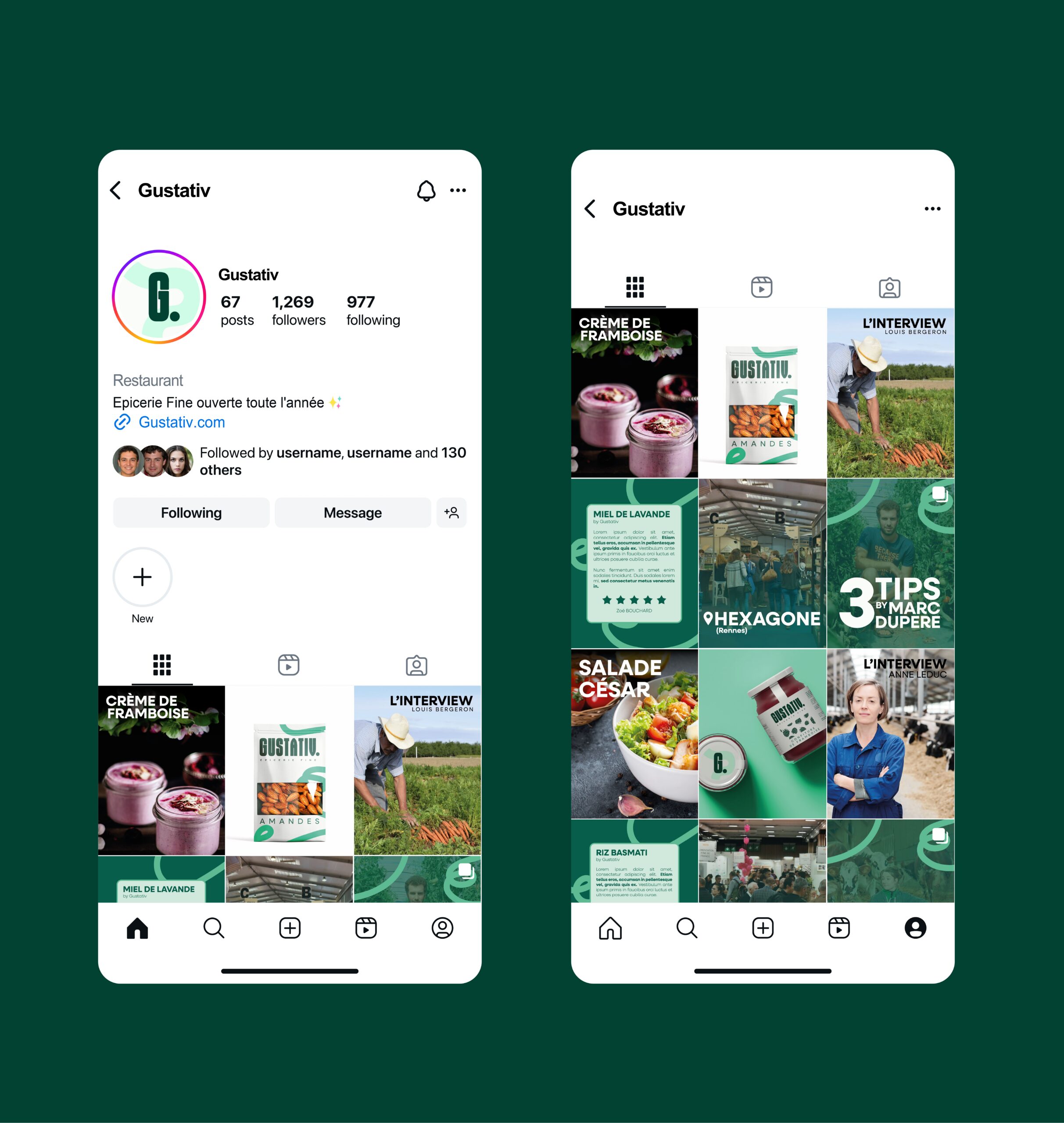 Réalisation d’une nouvelle charte graphique, de packaging et posts pour les réseaux sociaux pour la marque d’épicerie fine Gustativ dans le cadre d’un cours en management d’équipes créatives.